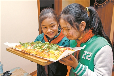 “比薩出爐了,好香??!”放學(xué)后,浙江省寧波市鄞州區(qū)江東外國語小學(xué)501班的何嘉蓉邀請同學(xué)王鈺綺來家里一起做比薩。只見她熟練地將已發(fā)酵好的面團(tuán)推開,搟成長方形的餅底,加上番茄、火腿、芝士等配料,再放進(jìn)烤箱烤。當(dāng)比薩新鮮出爐時,兩個人臉上樂開了花。