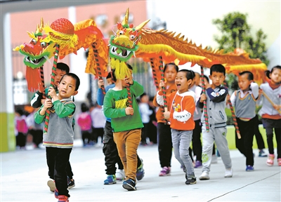4月10日,連城縣實驗幼兒園兒童展示“姑田游大龍”。福建省連城縣是客家非物質文化遺產大縣,連城縣實驗幼兒園打造非遺文化特色幼兒園,傳承傳統(tǒng)文化,活躍校園生活。新華社記者 彭張青 攝