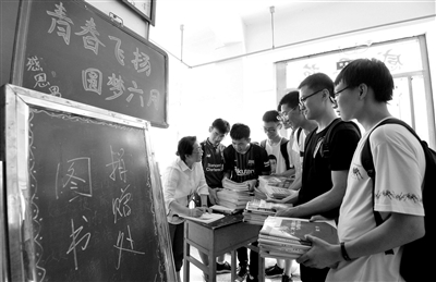 6月9日,在河北省邯鄲市第一中學(xué),高三畢業(yè)生在捐贈(zèng)書(shū)籍。