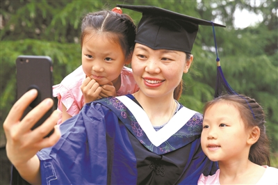 6月12日,兩位小朋友和“碩士媽媽”合影留念。當(dāng)日,湖南省衡陽市南華大學(xué)護理學(xué)院舉行2019屆畢業(yè)生學(xué)位授予典禮,部分畢業(yè)生的家人前來見證這一榮耀時刻。曹正平 夏藝萍 攝