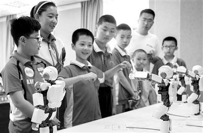 2019年6月13日,呼和浩特市玉泉區(qū)頭道巷小學(xué),小學(xué)生在與人工智能機器人互動。視覺中國 供圖