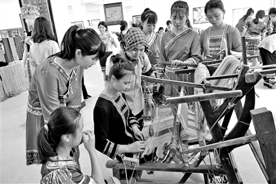 湖南省江華瑤族自治縣職業(yè)中專學(xué)校服裝專業(yè)學(xué)生正在學(xué)習(xí)瑤族織錦。從2013年起,該校將瑤族織錦融入服裝專業(yè)中,建立“校企融合+特色專業(yè)+定向就業(yè)”互利共贏的培養(yǎng)模式,傳統(tǒng)手工藝在新時(shí)代煥發(fā)出新的生機(jī),每年創(chuàng)收4000多萬(wàn)元。唐世日 陳永祥 攝