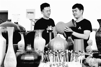 圖為吳浩宇(右)在該校大學(xué)科技園內(nèi)展示他的大漆藝術(shù)品。