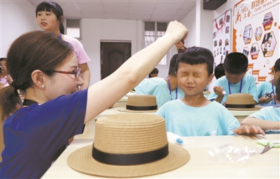 7月11日,教師將一只小鹿造型的裝飾擺在來自四川的李政豪頭上。當日,一堂名為“帽子戲法”的手工制作課在上海南翔工業(yè)開發(fā)區(qū)實業(yè)有限公司的職工親子工作室內(nèi)進行,30多名孩子在教師指導下學習草帽的裝飾。這些來自河南、四川、江西等地的小朋友利用暑期來到南翔工業(yè)區(qū),與在這里工作的爸爸媽媽團聚。從7月初到8月中旬,工業(yè)區(qū)親子工作室將舉辦一系列針對來探親的外來職工子女的免費活動,豐富“小候鳥”們的暑期生活,也解決職工的后顧之憂。