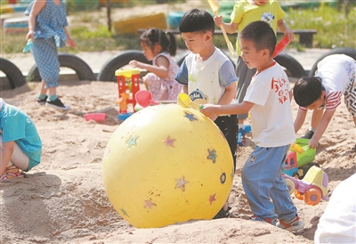 在沙池中,孩子們有的用水、鏟等在沙堆中挖一個窟窿,再由此挖出連接到某處的通道,建造想象中的“高速公路”;有的把沙、水混合,塑造喜歡的圖案、造型,還有的用沙子做“食物”玩起了“娃娃家”……他們用最簡單的工具和材料,構(gòu)建著最簡單的快樂。