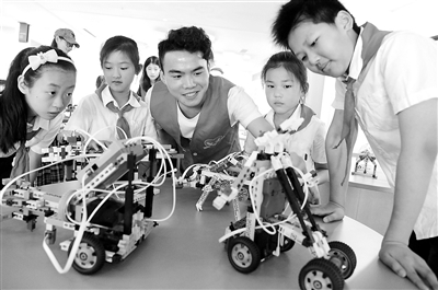 近日,志愿者在為小朋友講解科普模型的功能。暑假期間,江蘇省鎮(zhèn)江市潤(rùn)州團(tuán)區(qū)委聯(lián)合韋崗街道和江蘇大學(xué)開(kāi)展“科學(xué)夢(mèng)想家”科技夏令營(yíng)活動(dòng),志愿者帶領(lǐng)留守兒童和外來(lái)務(wù)工人員子女走進(jìn)睿泰數(shù)字教育科技館,樂(lè)享科技的魅力。石玉成 石夢(mèng) 攝