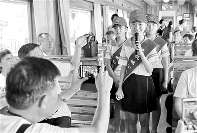 近日,河北省秦皇島市海港區(qū)和安里小學(xué)學(xué)生在“秦旅山海號(hào)”旅游列車上為游客講解長城歷史文化。海港區(qū)開展秦旅山海長城文化體驗(yàn)行活動(dòng),4所小學(xué)600余名學(xué)生擔(dān)任長城公益小講解員,分批次在“秦旅山海號(hào)”旅游列車上以快板、拍手歌、跳舞等多種形式為游客講解秦皇島長城文化,加深學(xué)生對長城精神、地域文化的認(rèn)識(shí),提高學(xué)生社會(huì)實(shí)踐能力。曹建雄 攝