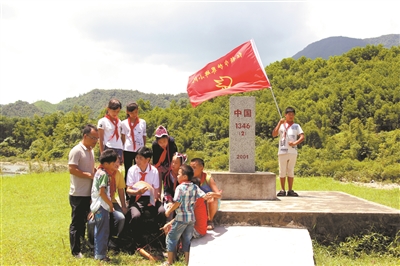 黃永騰帶著紅領巾護界碑小隊的隊員們,扛著紅旗,背著竹梆,拎著竹桶,唱著護界碑歌:“大山綠哩啰,大江清哩啰,青山綠水映領巾,映領巾啰,哎哩啰喲,哎哩啰,護界啰,愛界碑,風里雨里都不停啰。個個都是好隊員啰?!弊呦?346(2)號界碑。