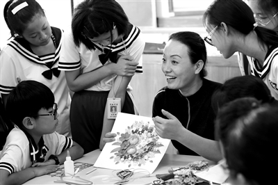 日前,在山東省煙臺(tái)市牟平區(qū)實(shí)驗(yàn)初級(jí)中學(xué)美術(shù)小組活動(dòng)中,師生們一起賞析學(xué)生劉軍婷創(chuàng)作的衍紙畫《繁花似錦》。這件作品旨在表達(dá)對(duì)祖國(guó)的祝福之情和對(duì)美好未來(lái)的期許。本報(bào)記者 鮑效農(nóng) 攝