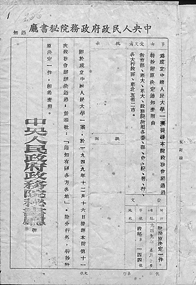 1949年12月16日,中央人民政府政務院第十一次政務會議通過《關于成立中國人民大學的決定》;12月19日,教育部頒布了《關于中國人民大學實施計劃的決定》。至此,中國人民大學經過近4個月的緊張籌備,宣告成立。