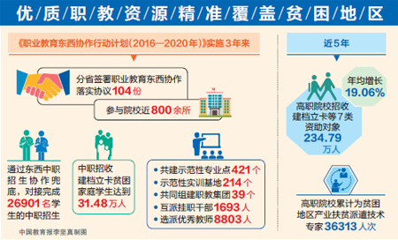 11月22日,在重慶舉行的職業(yè)教育與繼續(xù)教育扶貧專項(xiàng)工作交流活動(dòng)上,教育部職業(yè)教育與成人教育司曬出了職業(yè)教育東西協(xié)作行動(dòng)計(jì)劃的賬本,該計(jì)劃是職教扶貧的重點(diǎn)項(xiàng)目之一。
