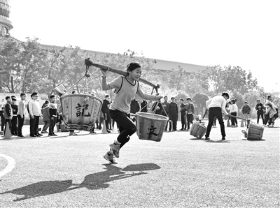 圖為學(xué)生在進(jìn)行挑米接力賽。近日,浙江省義烏市福田小學(xué)舉行第14屆趣味運(yùn)動(dòng)會(huì),這也是該校第二屆民俗文化節(jié)的一部分。為了傳承優(yōu)秀地方文化,學(xué)校每年12月舉行為期一天的民俗文化節(jié),邀請(qǐng)婺劇、藤編、木雕、竹藝、糖畫等義烏市非物質(zhì)文化遺產(chǎn)傳承者走進(jìn)校園一展身手。龔琴娟 攝