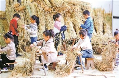 近日,江蘇如皋經濟技術開發(fā)區(qū)實驗幼兒園的小朋友在學習編草簾。大雪節(jié)氣剛過,該園開展知民俗,弘揚傳統(tǒng)文化活動,教師帶領小朋友走進田野,學習用秸稈編織草繩、草簾,用于包裹過冬果樹。徐慧 攝