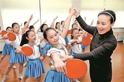 近日,江蘇省常州市蘭陵小學(xué)舞蹈社團師生在排練快樂乒乓操。1995年,乒乓球運動被該校設(shè)為特色項目,2003年該校開發(fā)乒乓校本課程。如今,該校不僅培養(yǎng)出大批乒乓球運動后備人才,還開展了做乒乓操、辦乒乓報、唱乒乓童謠等系列活動,“乒乓文化”已成為校園一道亮麗風(fēng)景。本報記者 鮑效農(nóng) 攝