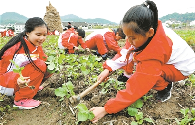 ▲近日,江西省婺源縣江灣中心小學五年級學生正在田間學習種油菜。當日,該校利用周末,組織五年級學生開展勞動教育活動,走進田間進行勞動體驗,受到學生及家長的歡迎。卓忠偉 汪海蛟 攝