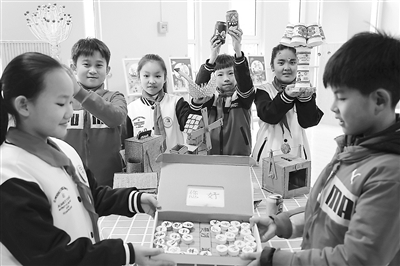 青島市崇德小學(xué)借助校本課程,開展“小手拉大手,共建綠色家園”垃圾分類指導(dǎo)活動(dòng),讓環(huán)保和垃圾分類的理念進(jìn)課堂、進(jìn)頭腦。學(xué)校自主開發(fā)了“綠色之旅”課程,將垃圾分類概念變?yōu)榫唧w的應(yīng)用指導(dǎo),學(xué)生自編垃圾分類小兒歌,宣講垃圾分類知識(shí),輪流擔(dān)任垃圾分類指導(dǎo)員。在“綠色之旅”課上,學(xué)生將學(xué)到的垃圾分類知識(shí)應(yīng)用到生活中,將可回收垃圾變廢為寶。圖為學(xué)生展示用垃圾飲料瓶蓋制作的象棋和用舊紙杯制作的臺(tái)燈等。