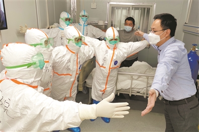 近日,經(jīng)過規(guī)范治療,由武漢大學(xué)中南醫(yī)院接管的武漢雷神山醫(yī)院一批患者康復(fù)出院。出院患者王先生(右一)表示:“堅(jiān)信我們一定能戰(zhàn)勝病魔,出院后我愿意捐獻(xiàn)自己的血漿,以救治更多新冠肺炎患者?!蓖跸壬€伸開雙臂,與醫(yī)護(hù)人員來個(gè)“空中擁抱”。