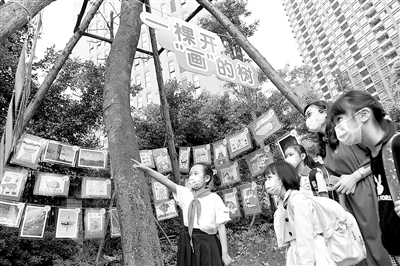 5月6日,四川省成都高新區(qū)菁蓉小學師生在觀看“宅家畫展”。當日,該校一至四年級學生返校復(fù)課,學校舉辦“宅家畫展”,在入校便道兩旁打造了一條200多米的文化長廊,展示學生居家期間創(chuàng)作的近千幅繪畫作品。