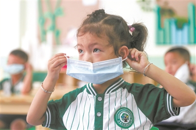 日前,四川省廣安華鎣市清溪路幼兒園在做好疫情防控工作的前提下,360多名幼兒按照計(jì)劃全面有序入園。圖為該園幼兒跟著老師學(xué)習(xí)戴口罩的正確方法。當(dāng)日,廣安市11萬余名幼兒走進(jìn)久違的幼兒園。