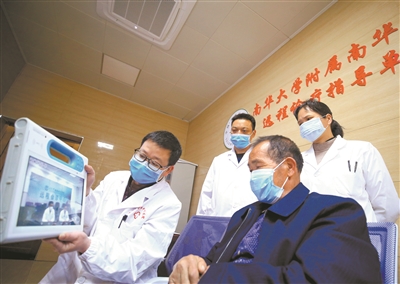 當(dāng)吳勝軒和鄒海貴走進(jìn)遠(yuǎn)程診療室時(shí),大屏幕已投射出南華大學(xué)附屬南華醫(yī)院負(fù)責(zé)會(huì)診的專家畫面?!袄先思?,您哪些地方不舒服,慢慢和我們說?!边h(yuǎn)在200多公里外的醫(yī)生緩慢而又大聲地對(duì)著屏幕說道。通過在線問診、查閱病歷和檢查結(jié)果,短短20分鐘后,醫(yī)生完成遠(yuǎn)程診療并制訂出治療方案。