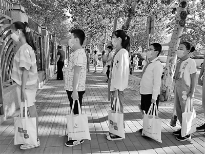 日前,山東省濟(jì)南市高新區(qū)豐奧嘉園小學(xué)的孩子們拎著學(xué)校統(tǒng)一發(fā)放的布書包復(fù)學(xué)。該校為學(xué)生減少了重復(fù)機(jī)械的作業(yè),每天每科作業(yè)由過去的8開大卷變成了現(xiàn)在的16開小卷,沒有任何教輔資料。書包減重,是要培養(yǎng)學(xué)生認(rèn)真完成作業(yè)、發(fā)展自己興趣、管理自己時間的好習(xí)慣。圖為該校學(xué)生早晨入校前等待人臉識別測溫。
