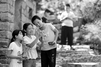 8月23日,河北省邢臺(tái)市內(nèi)丘縣獐么中心小學(xué)教師與村娃一起在村中拍攝美景。日前,社會(huì)愛心人士給獐么中心小學(xué)的留守兒童捐贈(zèng)了一批數(shù)碼相機(jī)、收音機(jī)等電子產(chǎn)品,豐富孩子們的假期生活。劉繼東 攝