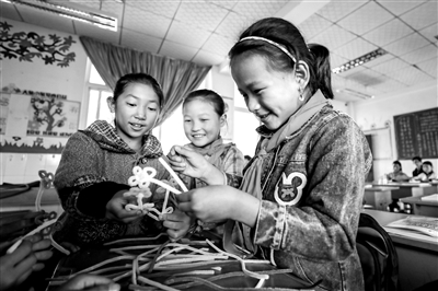 9月1日,四川省涼山彝族自治州普格縣五道箐鄉(xiāng)中心校四年級學(xué)生楊紫怡(右一)和同學(xué)們互贈“小絨花”禮物,表達開學(xué)的喜悅之情。當(dāng)日,涼山州中小學(xué)生結(jié)束假期生活回到學(xué)校,迎來新學(xué)期。本報記者 單藝偉 攝