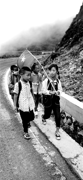 9月3日上午,四川省涼山州金陽縣天地壩鎮(zhèn)吉史里口村的幾名孩子走在上學(xué)路上。他們從家到學(xué)校需要走大概40分鐘,由于上學(xué)放學(xué)需要經(jīng)過一段國道主干線,為了保證安全,學(xué)校將村里的孩子分成若干個(gè)小組,每天由小組長扛著少先隊(duì)隊(duì)旗,領(lǐng)著同學(xué)一同行動(dòng)。