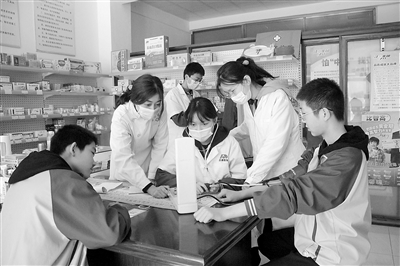 日前,山東省安丘市大汶河旅游開(kāi)發(fā)區(qū)大華中學(xué)初一(2)班學(xué)生走進(jìn)社區(qū)衛(wèi)生所開(kāi)展職業(yè)體驗(yàn)活動(dòng),在醫(yī)師指導(dǎo)下為同學(xué)測(cè)量血壓。近年來(lái),該校把職業(yè)體驗(yàn)教育作為人生規(guī)劃指導(dǎo)課程的重要內(nèi)容,讓學(xué)生在實(shí)踐中獲得體驗(yàn)、體悟和體認(rèn),培養(yǎng)職業(yè)興趣和動(dòng)手能力。解文卿 攝