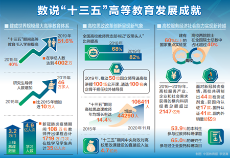 “我國已建成世界規(guī)模最大的高等教育體系?!眳菐r介紹,“十三五”期間,高等教育毛入學率不斷提升,由2015年的40%提高到2019年的51.6%,在學總?cè)藬?shù)達到4002萬。