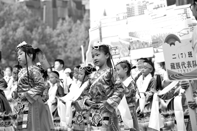 體育活動(dòng)與民族文化可以碰撞出怎樣的火花?日前,浙江省江山市城南小學(xué)在第六屆體育節(jié)開幕式上,47個(gè)班級(jí)圍繞“各異的民族風(fēng)采”主題亮相,學(xué)生們在體育活動(dòng)中感受不同民族文化,為體育活動(dòng)增添別樣色彩。圖為浙江省江山市城南小學(xué)二(7)中隊(duì)展示藏民族文化風(fēng)采。