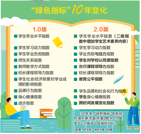 在“綠色指標”2.0版中,10個一級指標修訂為學生學業(yè)水平、學生身心健康、學生品德和社會化行為、學生學習動力、學生對學校認同度、學業(yè)負擔與壓力、教師課程領導力、校長課程領導力、教育公平、跨時間發(fā)展變化。