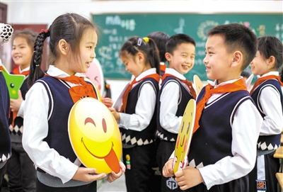 5月6日,江蘇省海安市城南實(shí)驗(yàn)小學(xué)開展“笑迎微笑日”主題活動(dòng),通過繪制笑臉卡、比笑臉等方式,迎接5月8日“世界微笑日”的到來。圖為該校學(xué)生手拿笑臉卡相互微笑。翟慧勇 攝