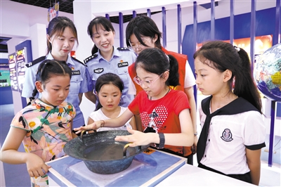 暑期,江蘇省丹陽市公安局為了解決民警因工作繁忙等無法照看子女的問題,與市教育局一起開設(shè)了包括硬筆書法、籃球、羽毛球等“警寶”暑托班。為了豐富暑托班教育形式,志愿者帶領(lǐng)“警寶”們走進(jìn)科普體驗館,學(xué)習(xí)科普知識,享受科技知識帶來的快樂。封疆江 攝