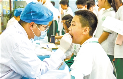 近日,醫(yī)生在為學生做牙齒檢查。北京市通州區(qū)南關小學組織全體學生進行每年一次的例行身體檢查,包括眼科、內(nèi)科等9大項25小項常規(guī)檢查,及時了解學生身體生長情況,科學管理學校衛(wèi)生保健工作。宋利成 攝