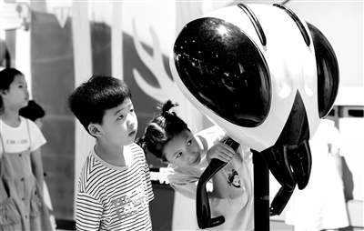 ?、?月30日,在山東省棗莊市科技館,小朋友在了解“小黃蜂”飛行的奧秘。