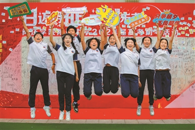 近日,福建省福州市閩江學(xué)院附屬中學(xué)高三學(xué)生手舉標(biāo)語牌共同加油。臨近高考,福州市的街道、學(xué)校、醫(yī)院等共建單位,通過奔跑加油、宣誓等方式,幫助高考學(xué)生放松身心。謝貴明 攝