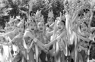 甘肅省敦煌市東街小學(xué)的“小飛天”舞蹈隊進(jìn)行敦煌舞蹈展演。張學(xué)軍 攝