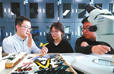 在浙江農(nóng)林大學(xué)7號(hào)教學(xué)樓的標(biāo)本室里,王吉銳老師(左)在指導(dǎo)植物保護(hù)專業(yè)定向農(nóng)科生制作昆蟲標(biāo)本。