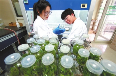 在浙江農(nóng)林大學(xué)智能樓的鐵皮石斛育苗室里,林學(xué)(林業(yè)技術(shù))專業(yè)定向農(nóng)科生葉沛陽(右)在跟隨研究生學(xué)姐進(jìn)行專業(yè)實(shí)踐。