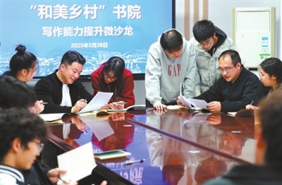 在浙江農(nóng)林大學(xué)集賢學(xué)院的一間學(xué)習(xí)室里,韓瀟(右二)和童家飛(右六)老師在指導(dǎo)定向農(nóng)科生進(jìn)行公文寫作。