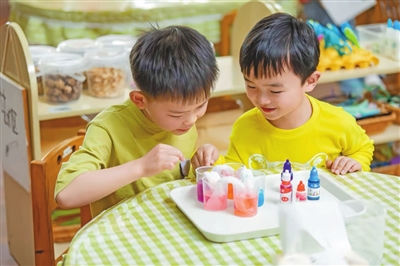 新學(xué)期,為幫助孩子們盡快適應(yīng)幼兒園生活,重慶市北碚區(qū)縉云幼兒園的教師提供了豐富多樣的游戲材料,讓孩子們在歡樂中開啟認(rèn)知世界的大門。圖為孩子們專注地進(jìn)行色彩小實(shí)驗(yàn)。