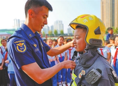 近日,在河北省秦皇島市海港區(qū)南嶺路小學,消防指戰(zhàn)員在指導學生穿消防服。 曹建雄 攝