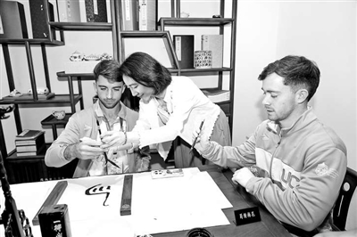 ②外國運動員體驗漢字書法,領略中華優(yōu)秀傳統(tǒng)文化魅力。 賽事組委會供圖