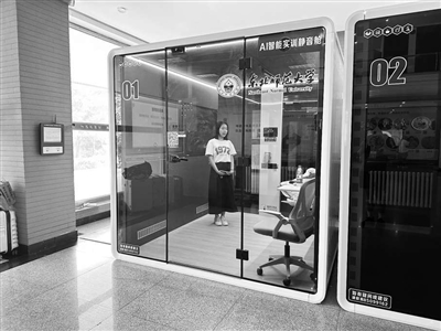 ①在東北師范大學(xué),學(xué)生正在使用師范生實(shí)習(xí)實(shí)訓(xùn)智能靜音艙練習(xí)講課。