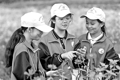 沭陽縣懷文小學(xué)學(xué)生在公園中觀察植物的生長情況,記錄植物的發(fā)芽、開花等過程。胡威 攝