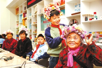 10月27日,江蘇省連云港市連云區(qū),學(xué)生給老人戴上簪花發(fā)箍。當(dāng)日,連云區(qū)墟溝街道桃園社區(qū)聯(lián)合東港小學(xué)開(kāi)展民俗文化體驗(yàn)活動(dòng),讓小學(xué)生和老人共同迎接重陽(yáng)節(jié)。 朱華南 攝