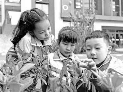 ①廣元市實驗小學的學生觀察校內植物。董彬 攝