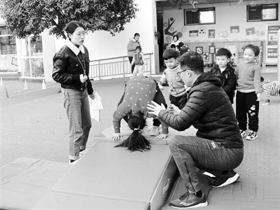 教師幫助幼兒做“前滾翻”。 賈偉 攝