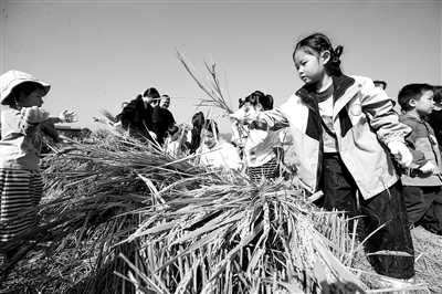 近日,浙江省湖州市吳興區(qū)東林鎮(zhèn)保國村東林鎮(zhèn)中心幼兒園的小朋友在體驗拾稻穗。 何偉衛(wèi) 攝